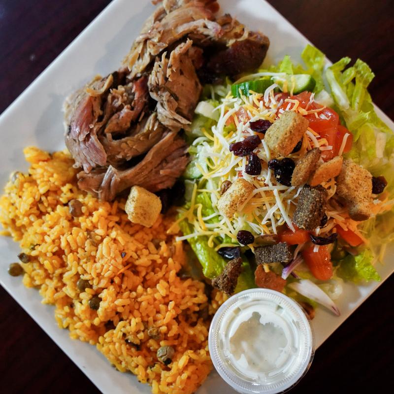Plate, Puerto Rican yellow rice with beans (gandules) with a side salad